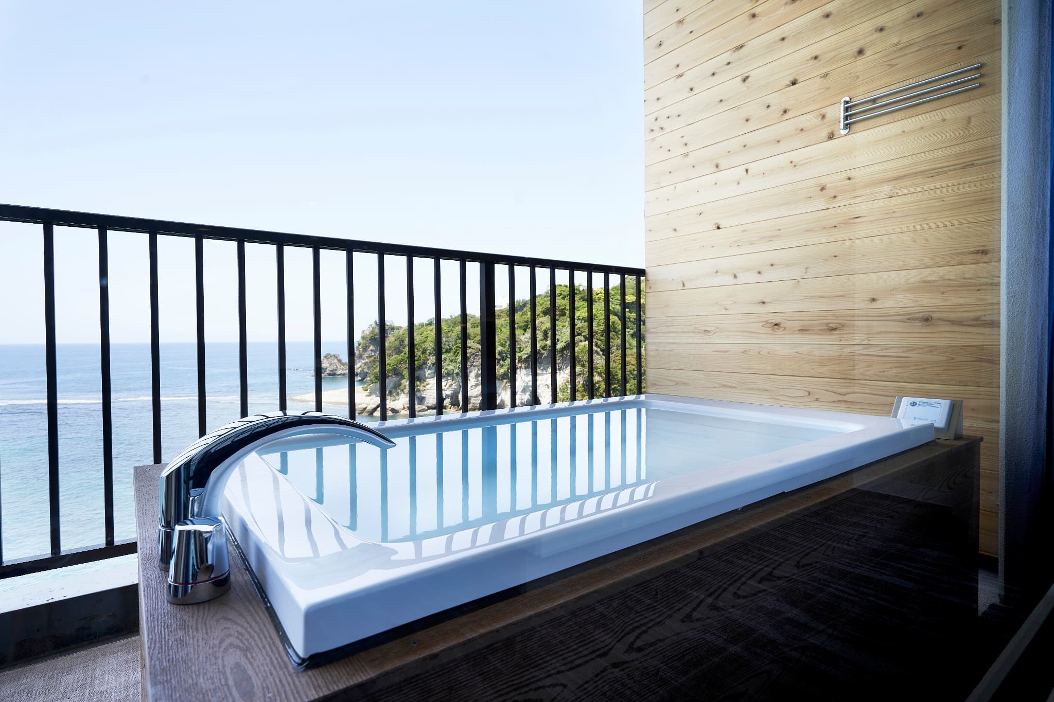 4名様までご利用いただけるデラックスオーシャンビューツイン。(露天マイクロバブルバス付) テラスに設置された露天マイクロバブルバスに浸かって、堂ヶ島の絶景をお楽しみください。 客室の露天風呂では、より開放感を味わっていただくために専用の湯浴み着をご用意しております。