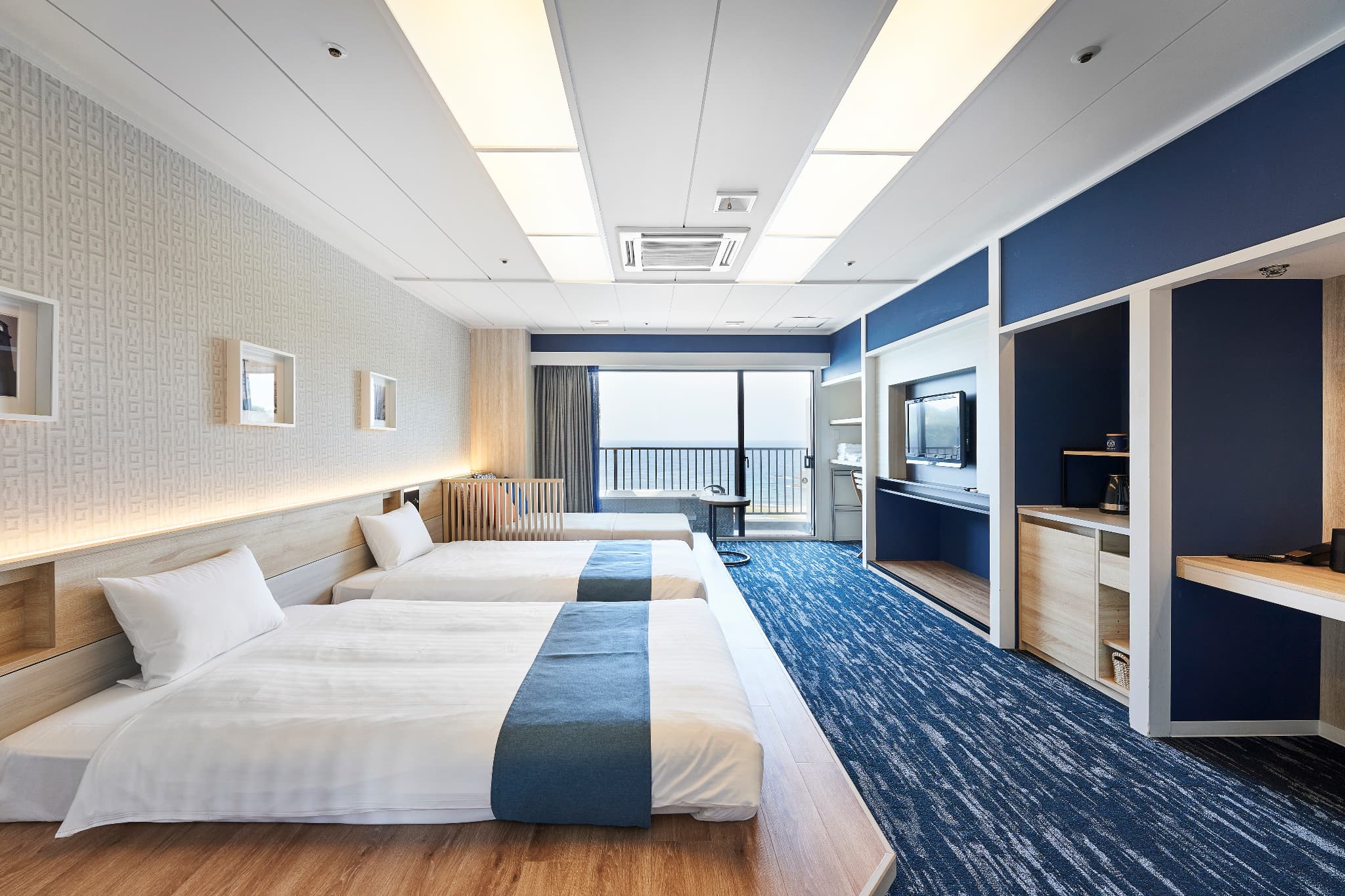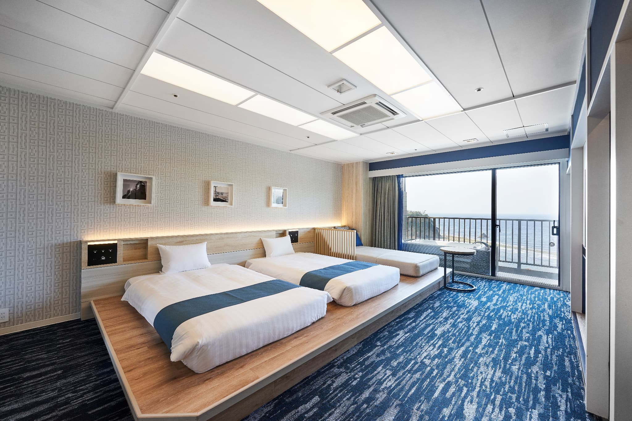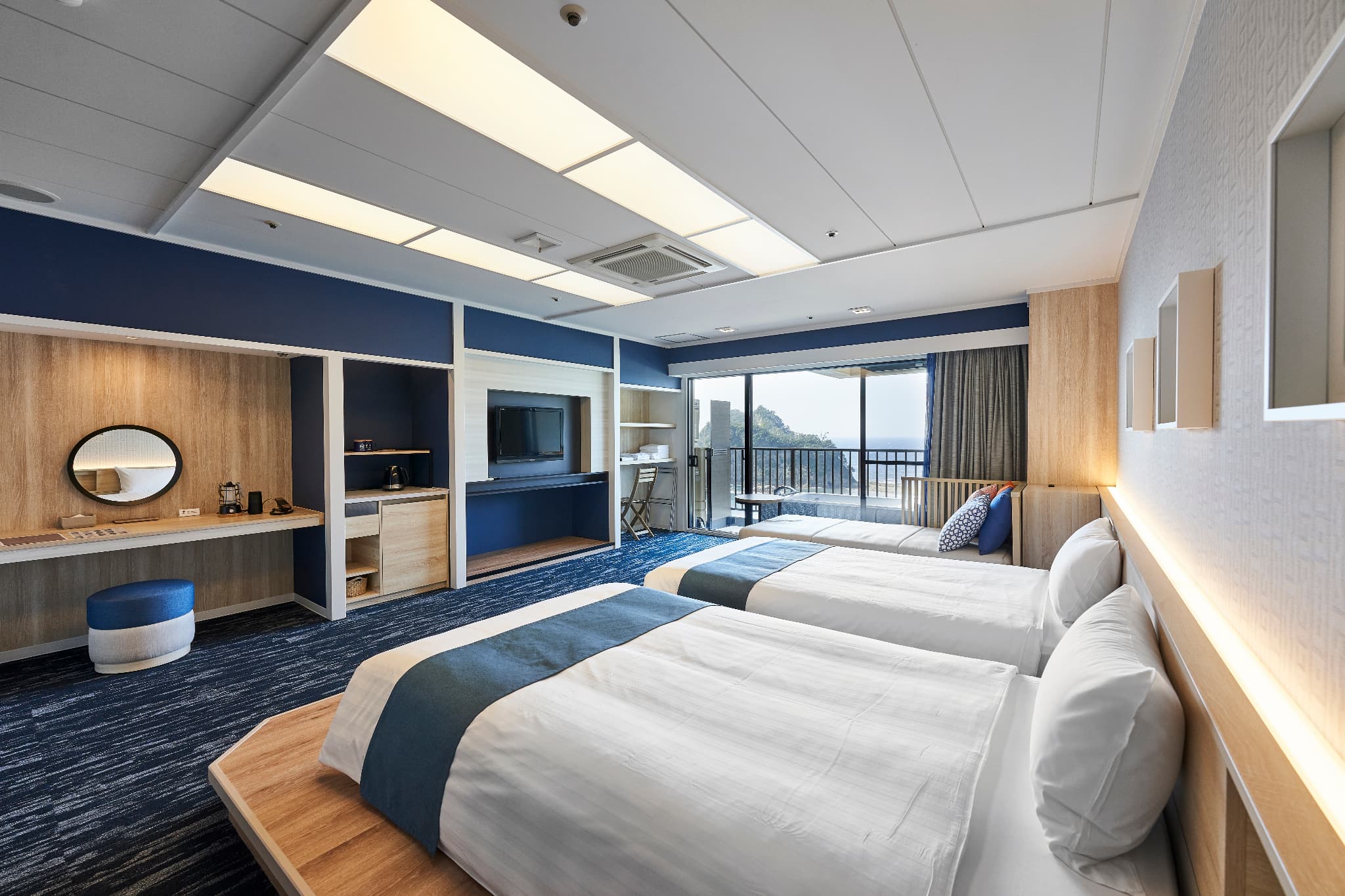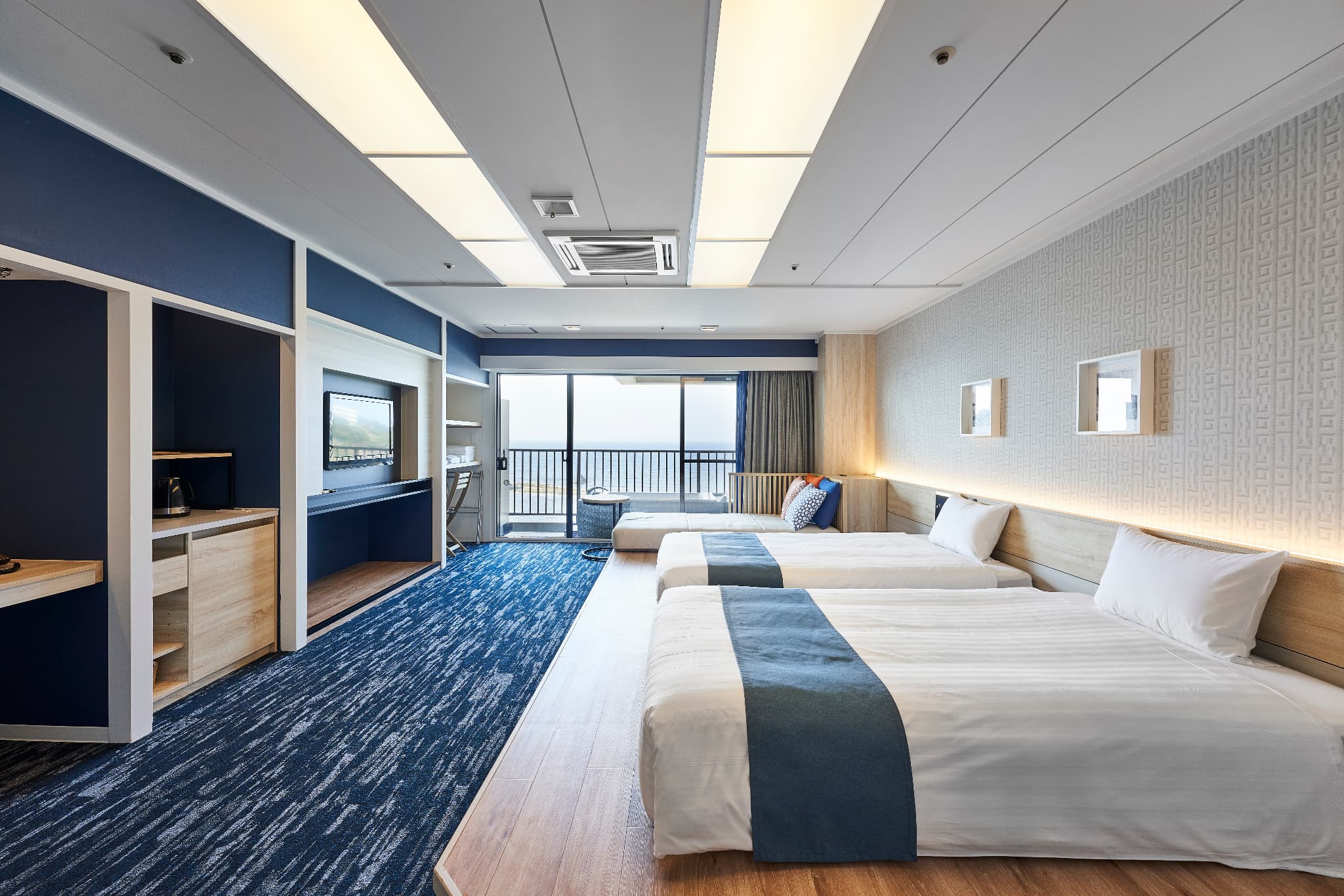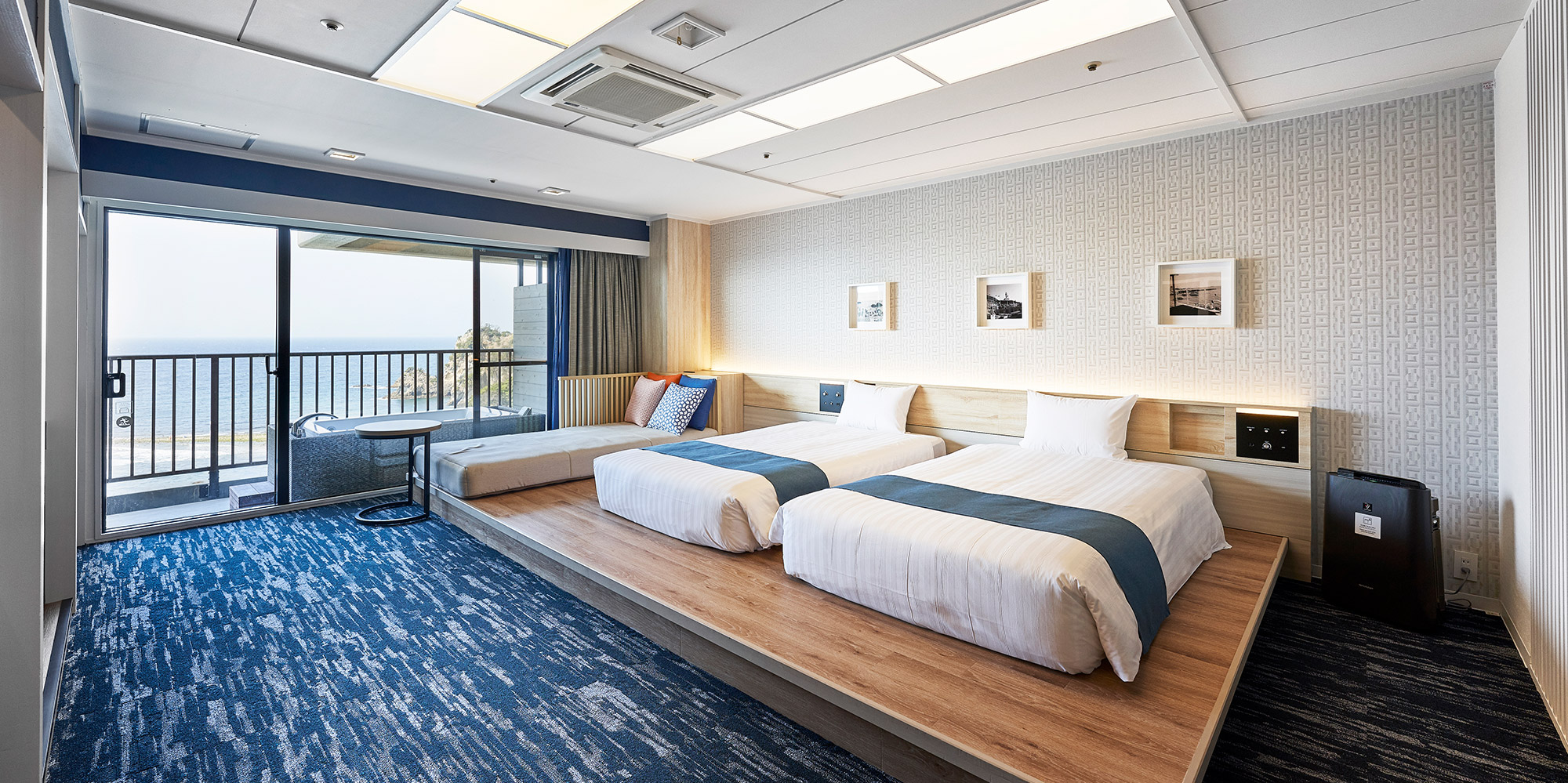 デラックスオーシャンビューツイン(露天マイクロバブルバス付) 広 さ: 室内 44m² + テラス 7.1m² 定 員: 4名 ベッド数: 2(最大 4 / うちソファーベッド×1) ベッドサイズ: 120cm × 195cm ソファーベッド: 101cm × 207.5cm アメニティ:詳細はこちら その他: 禁煙