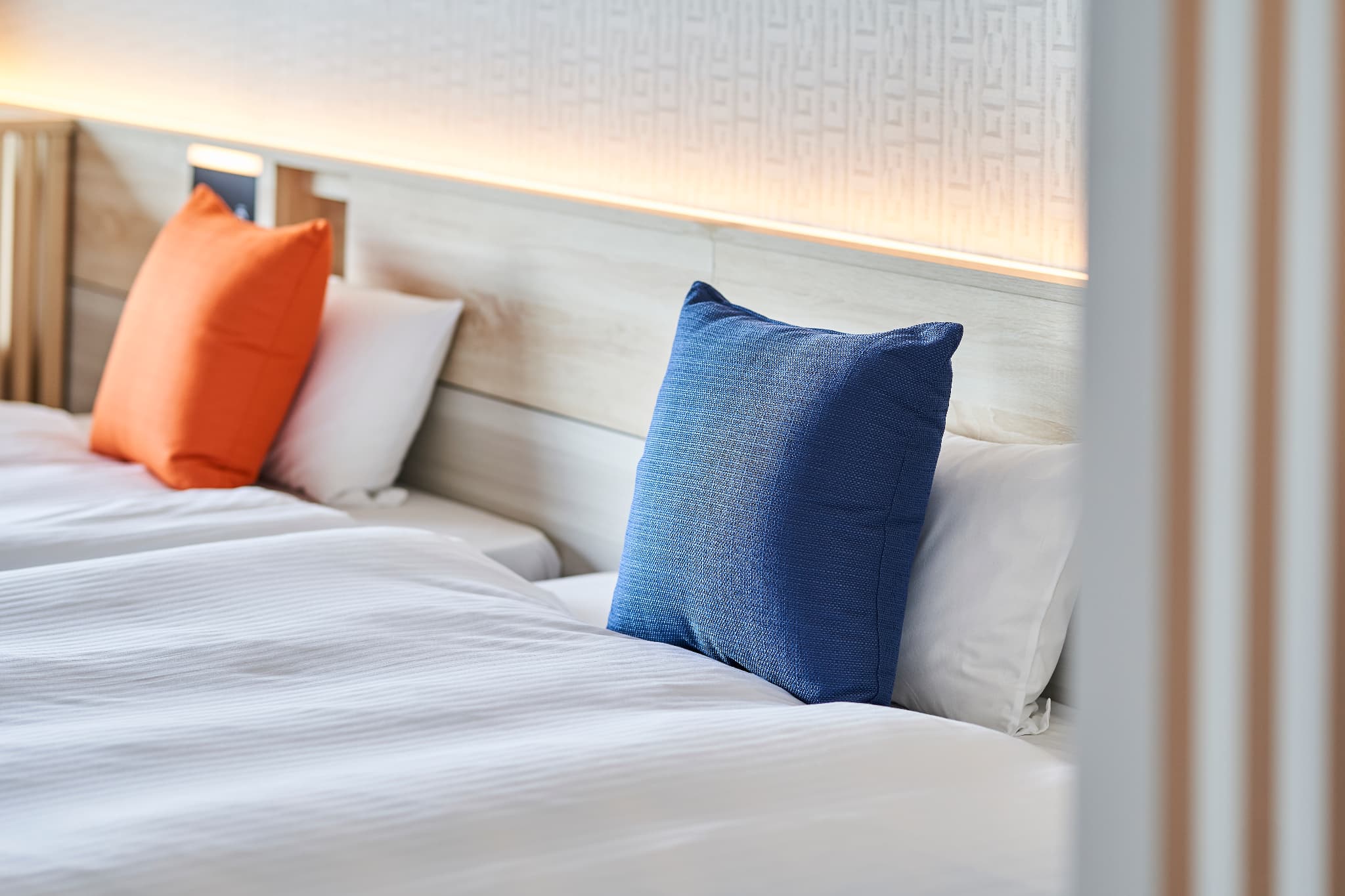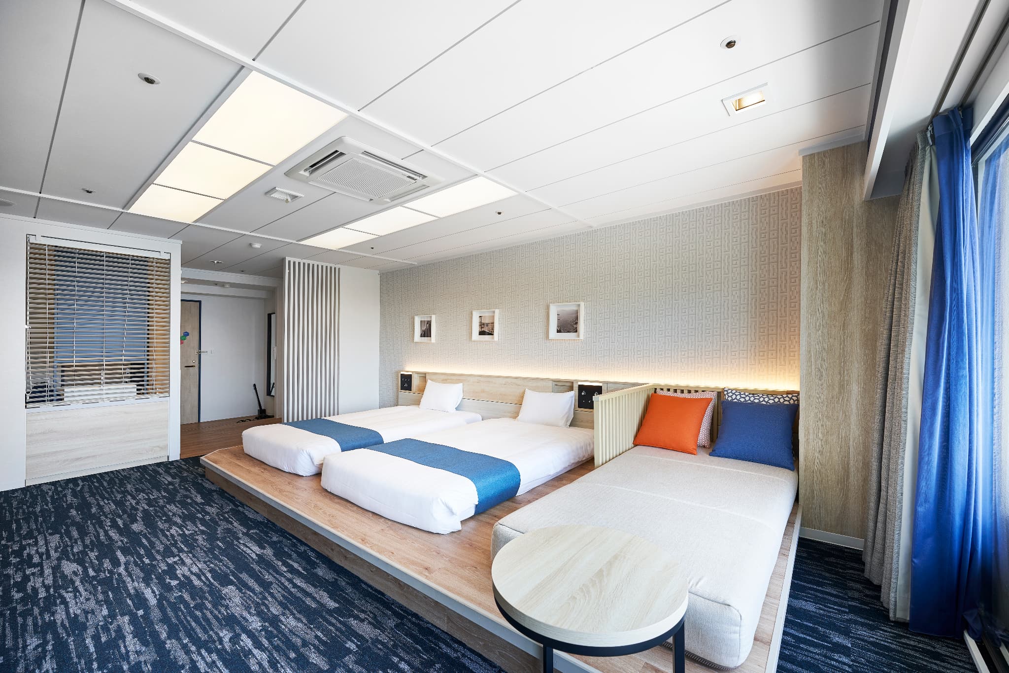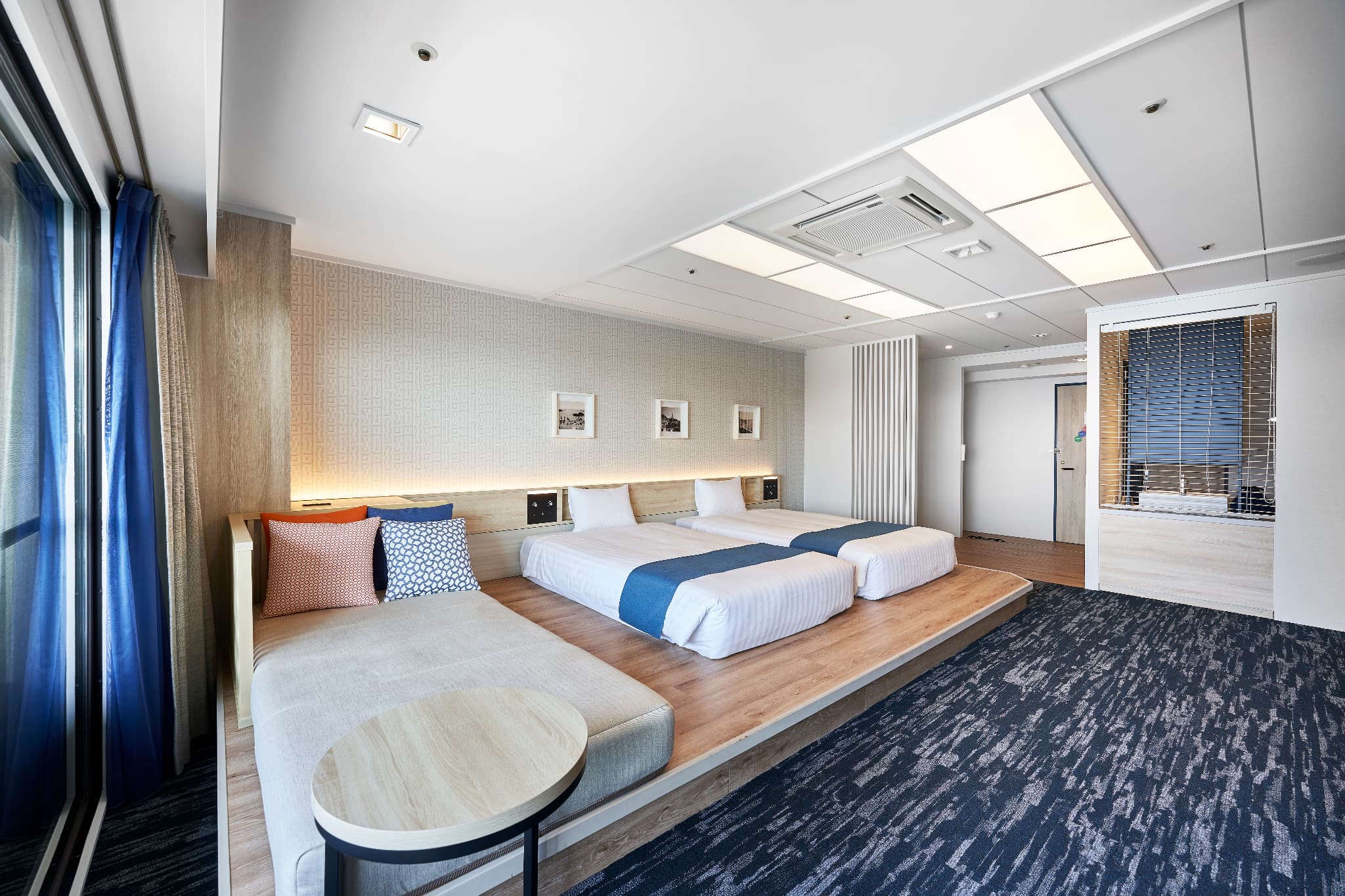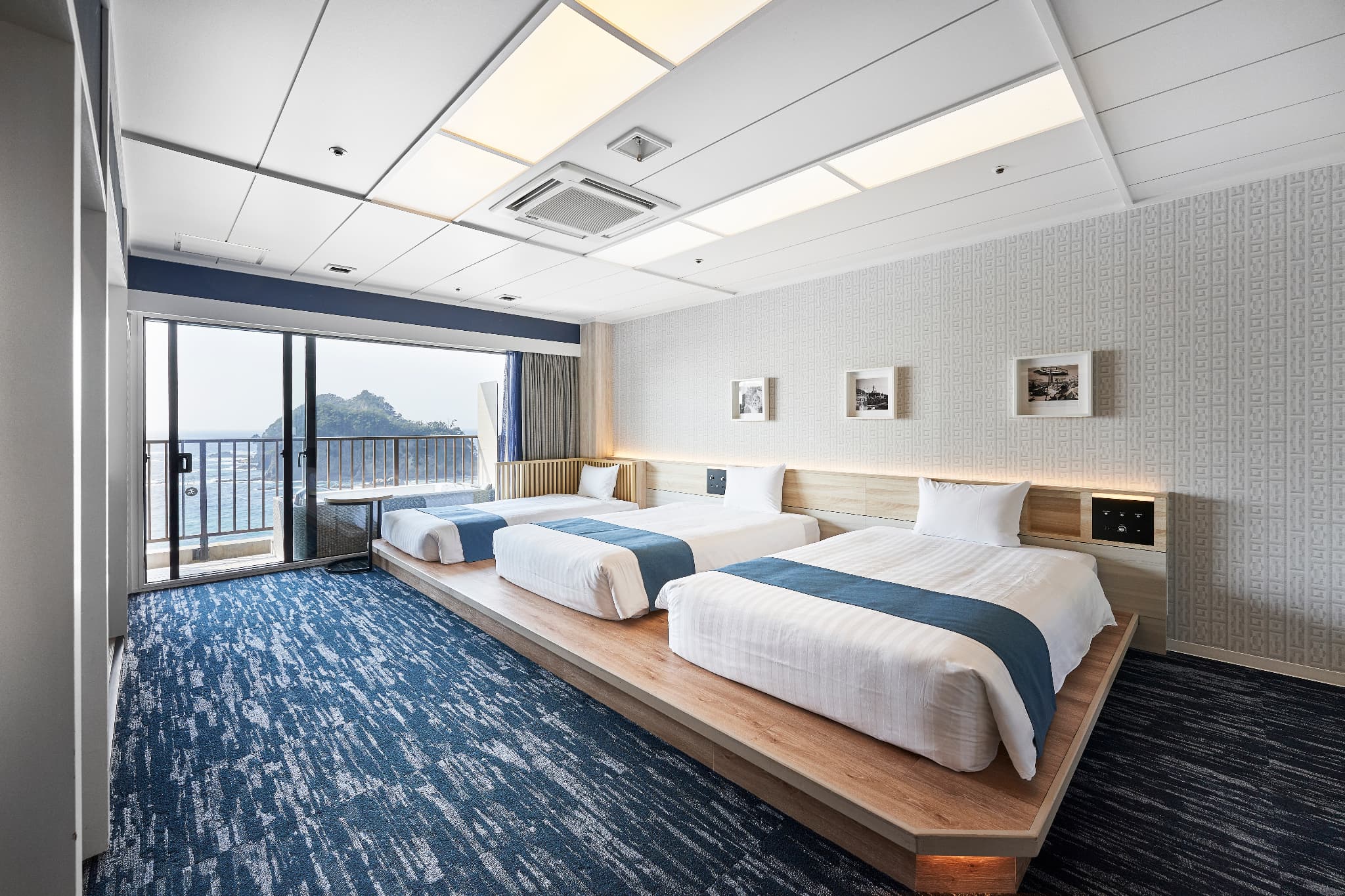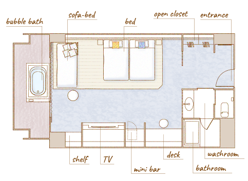 デラックスオーシャンビューツイン(露天マイクロバブルバス付) 広 さ: 室内 44m² + テラス 7.1m² 定 員: 4名 ベッド数: 2(最大 4 / うちソファーベッド×1) ベッドサイズ: 120cm × 195cm ソファーベッド: 101cm × 207.5cm アメニティ:詳細はこちら その他: 禁煙