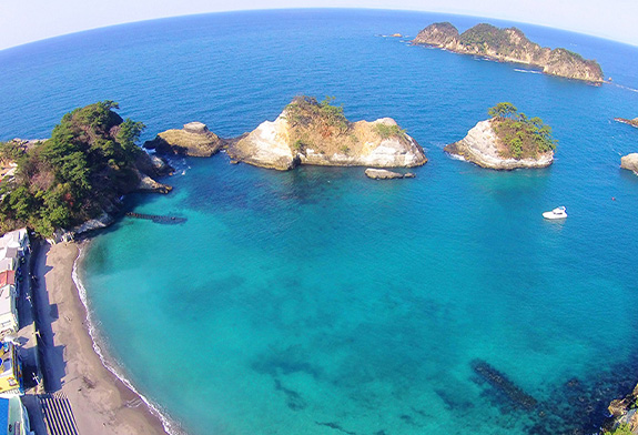 「堂ヶ島」の中心にある、岩に囲まれたファミリーに人気の海岸です。内海なので波が穏やかで透明度が高く、豊かな自然に恵まれ、景勝地として有名です。