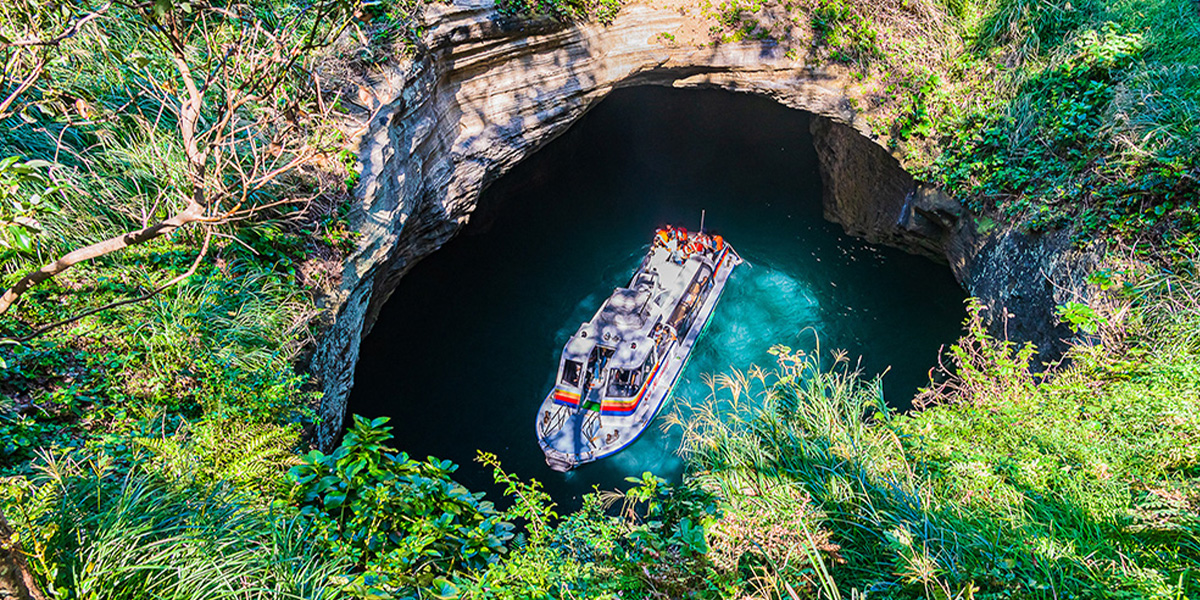 名前の通り天井が丸く抜け落ちて天窓となっているので洞窟内は明るく、